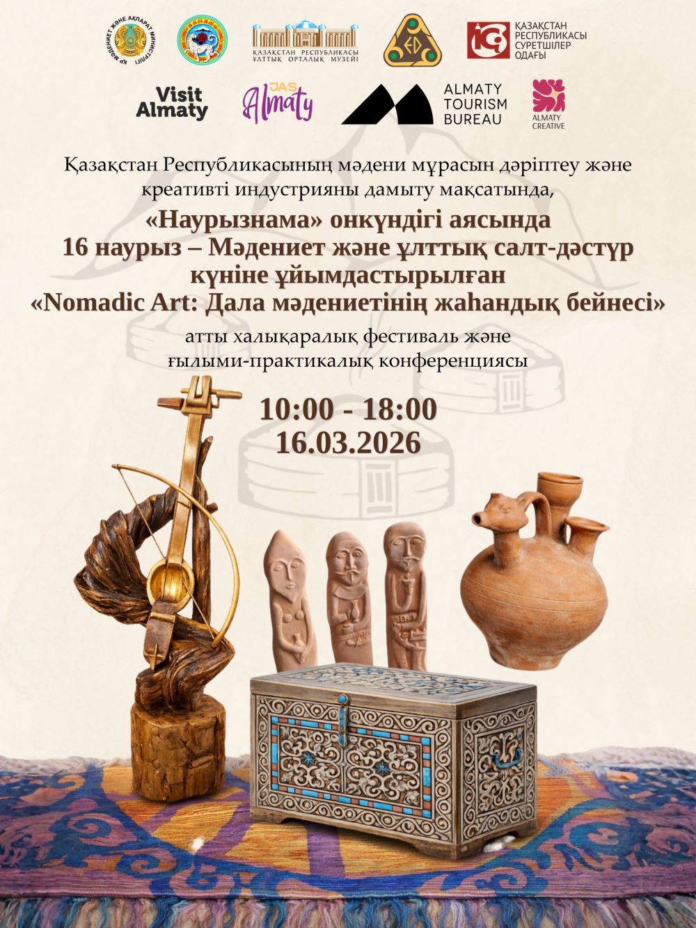 On March 16, 2026, at 11:00 AM, the National Museum of the Republic of Kazakhstan, together with the Union of Kazakh Ethno-Designers, will organize and host the international festival and scientific-practical conference “Nomadic Art: The Global Image of the Great Steppe Culture”, dedicated to March 16 — Day of Culture and National Traditions.