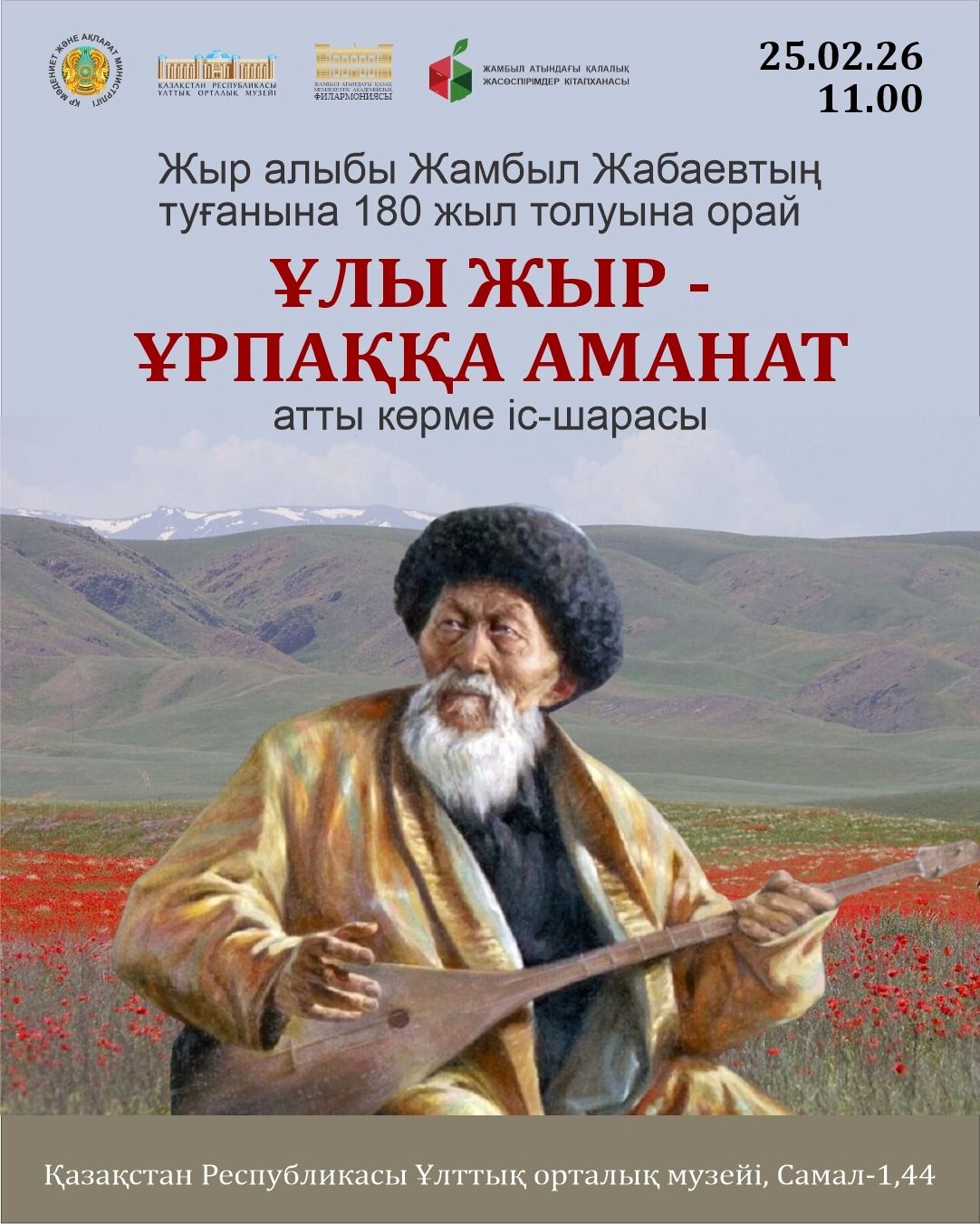 Қазақстан Республикасы Ұлттық орталық музейі 2026 жылдың 25 ақпаны күні сағат 11.00-де Жыр алыбы Жамбыл Жабаевтың туғанына 180 жыл толуына орай «Ұлы жыр – ұрпаққа аманат» атты көрме іс-шарасын өткізеді.