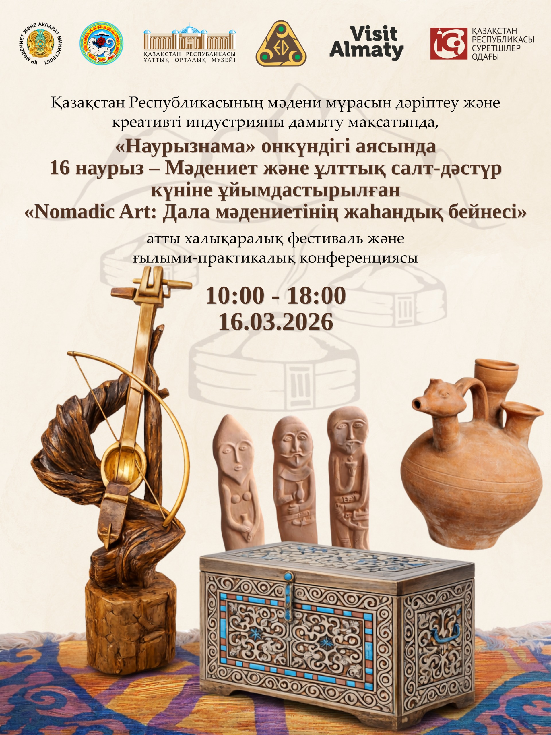 Қазақстан Республикасы Ұлттық орталық музейі, Алматы қаласы әкімдігінің Туризм басқармасы мен Қазақстан этнодизайнерлер одағымен бірлесіп 2026 жылдың 16 наурызы күні сағат 11.00-де «Наурызнама» онкүндігі аясында, 16 наурыз – Мәдениет және ұлттық салт-дәстүр күніне орай, Алматы қаласында алғаш рет «Nomadic Art: Дала мәдениетінің жаһандық бейнесі» атты халықаралық фестиваль және ғылыми-практикалық конференциясын өткізеді.