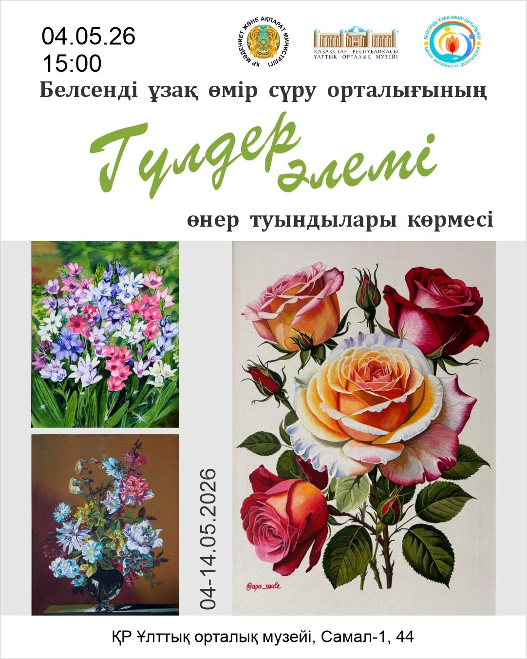 2026 жылғы 4 мамыр күні сағат 15:00-де Қазақстан Республикасы Ұлттық орталық музейінде Алматы қаласы Белсенді ұзақ өмір сүру орталығының қатысушылары дайындаған «ГҮЛДЕР ӘЛЕМІ» атты көркемөнер көрмесі ашылады.