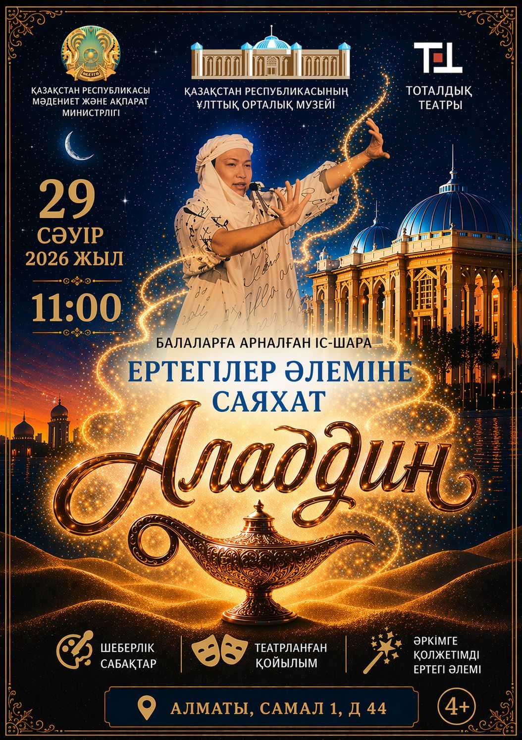 ҚР Ұлттық орталық музейі мен Тоталды театр бірлесіп Инклюзивті балаларға арнап 2026 жылдың 29 сәуір күні «Ертегі әлеміне саяхат» атты тәрбиелік іс-шара ұйымдастырады.